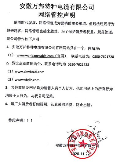鄭重聲明:安徽萬邦特種電纜有限公司官方網站為:www_wanbangcable_com.aeplfw.cn,除此之外無任何子網站或合作網站,其余均為假冒偽劣。電話:0550-7621728 13485756353 地 址:安徽省天長市滁州高新技術產業開發區經四路29號